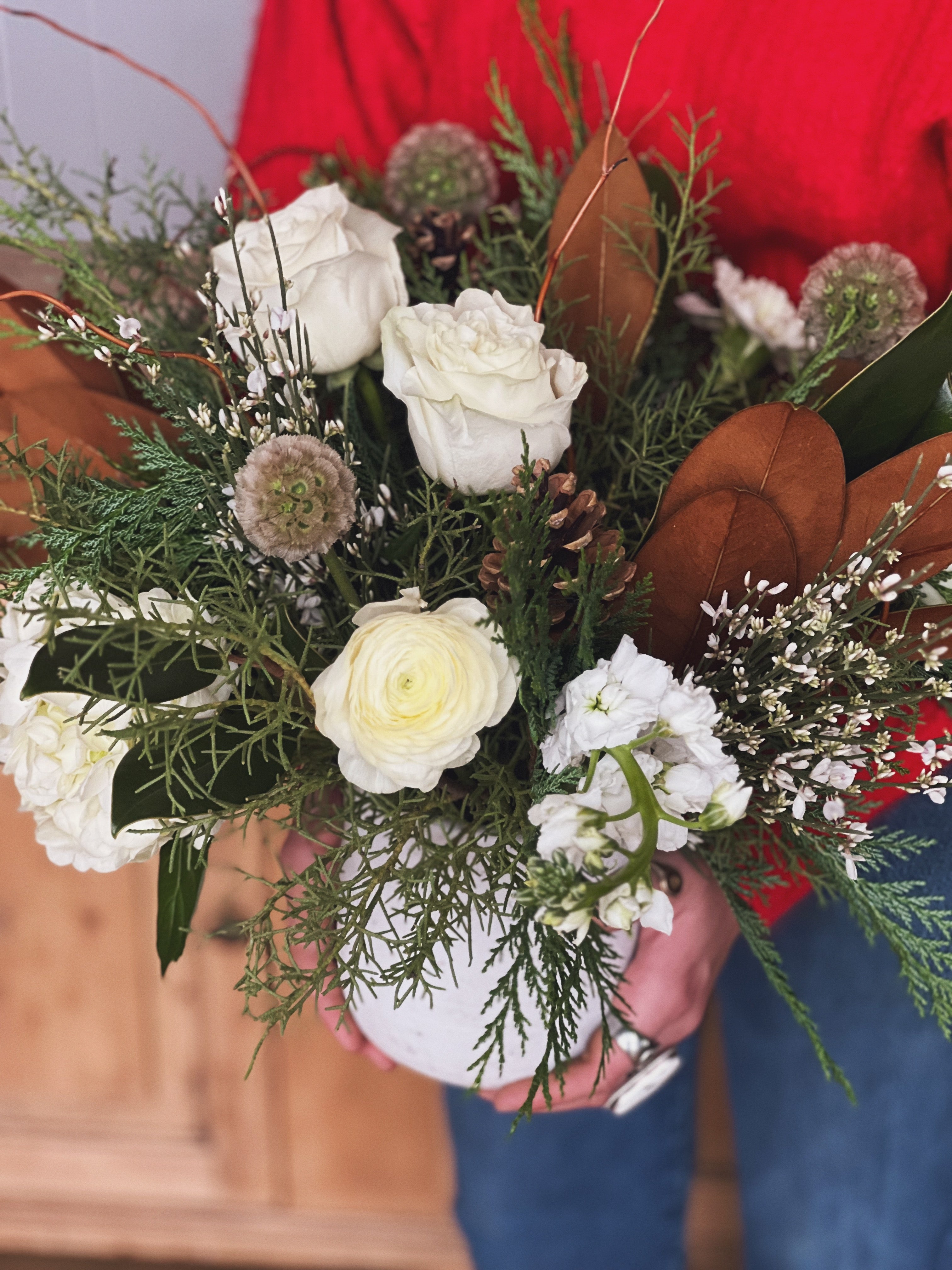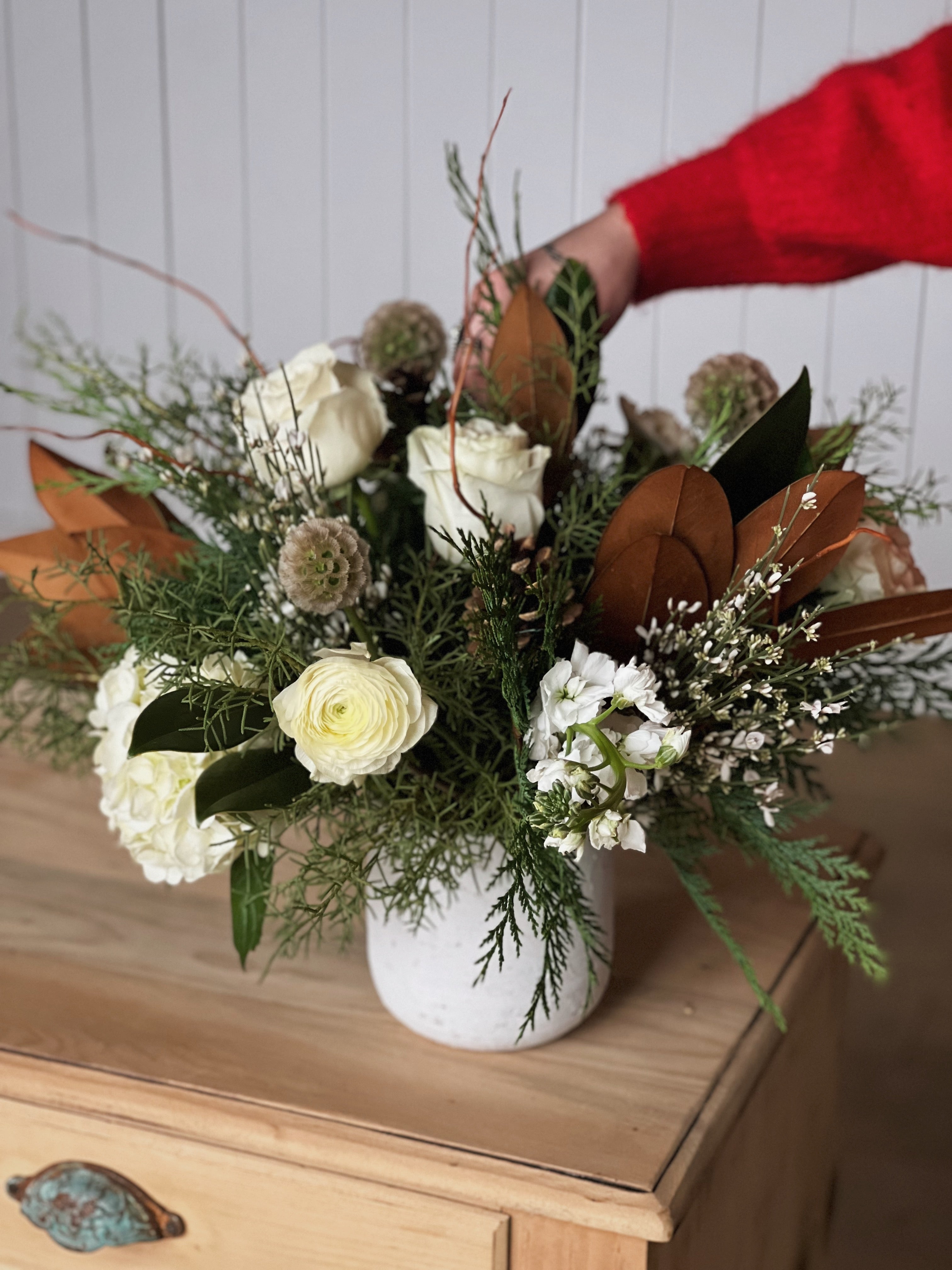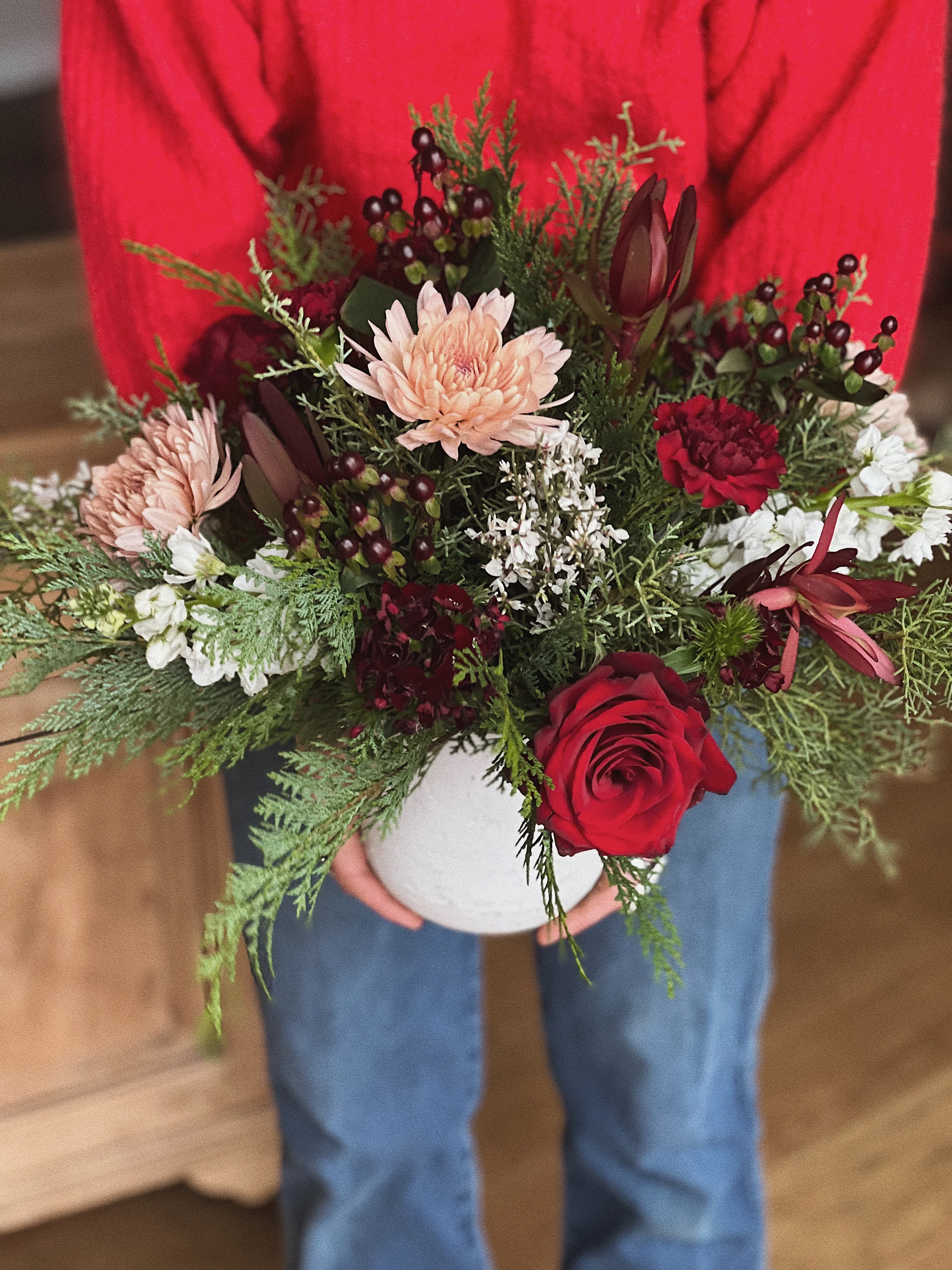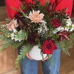 Perfect for any tablescape or counter space! These centerpieces are lush with holiday greens, berries, branches, pine cones and other fantastic lush blooms!