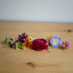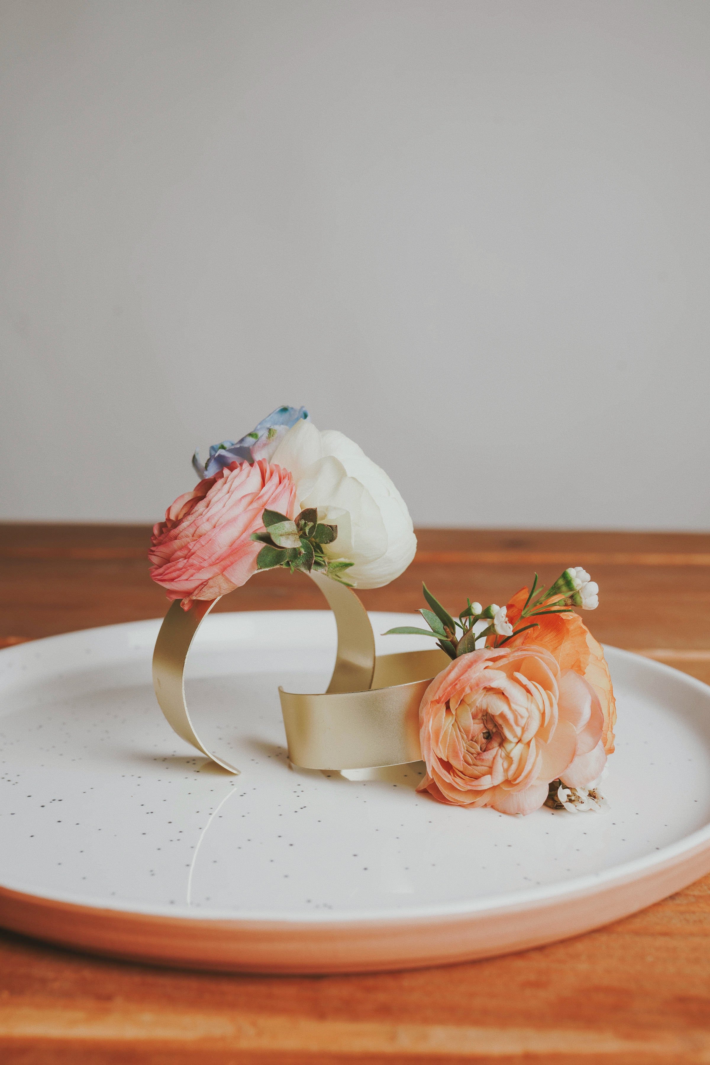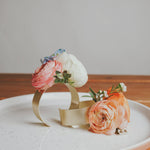 Flowers vary based on seasonal availability. Cottagecore is pictured with a brushed gold cuff.