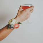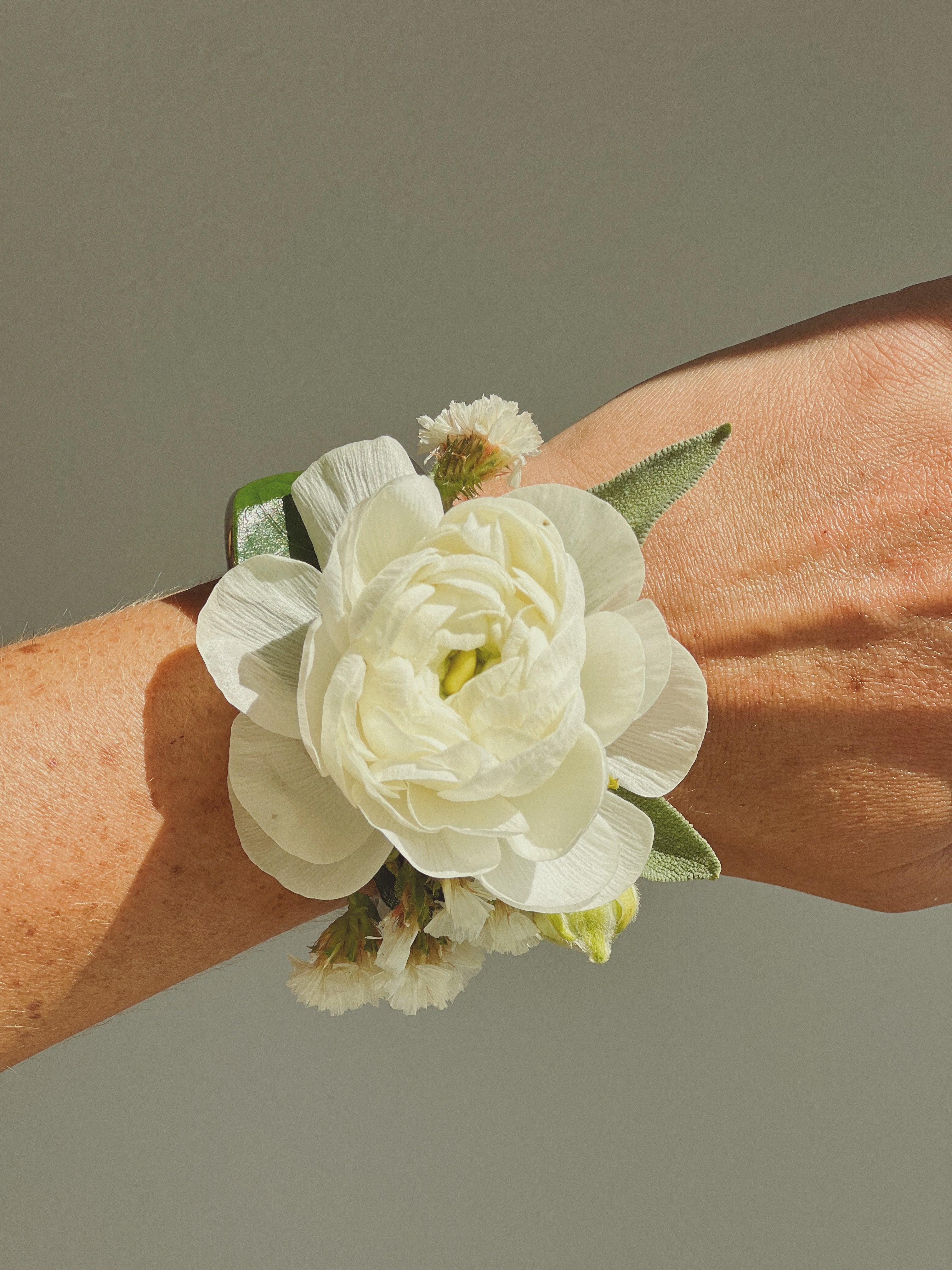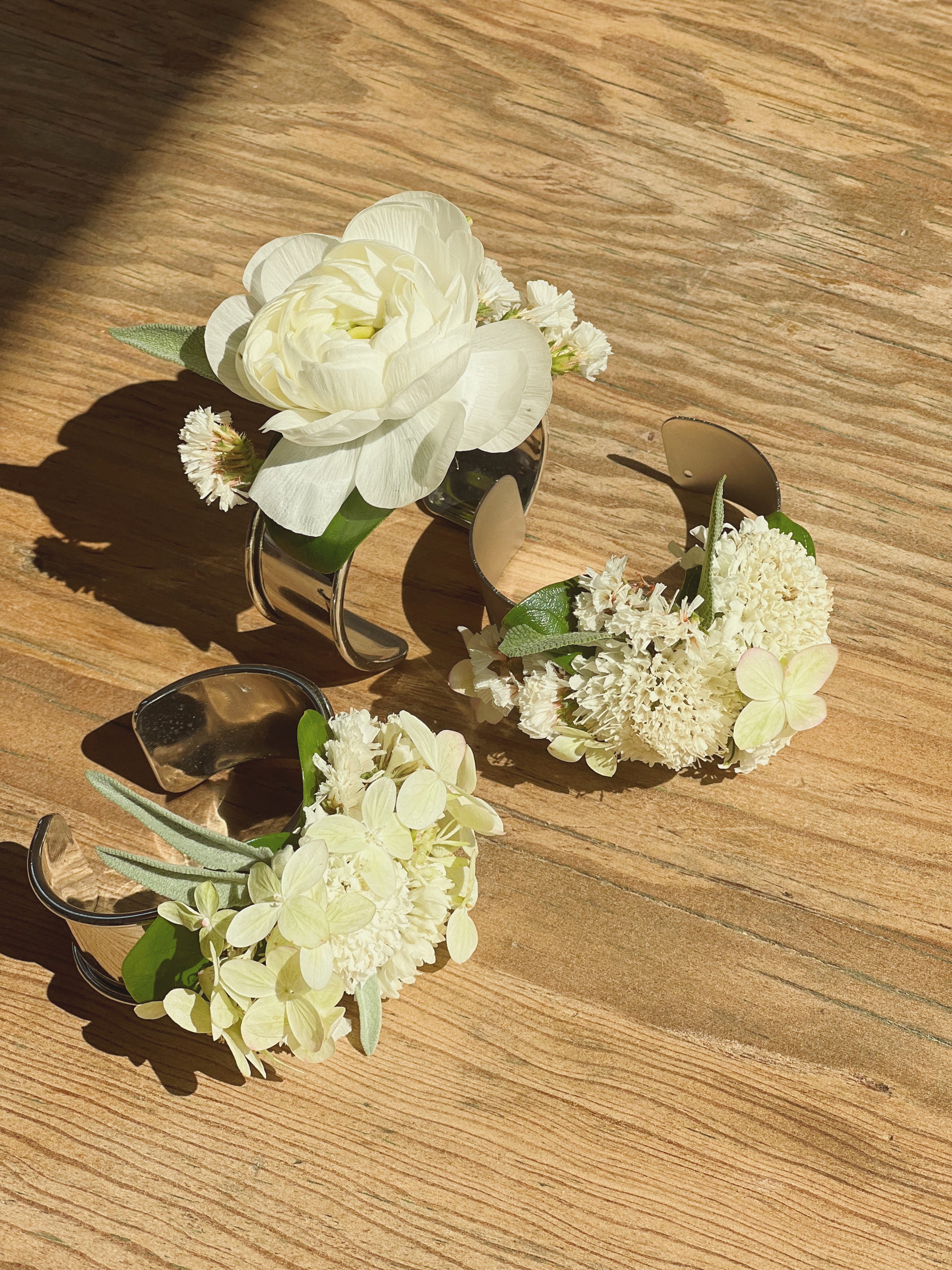 A beautiful work of art for your wrist! Our corsages are handcrafted with dainty flowers and greenery on a brushed silver or gold cuff.