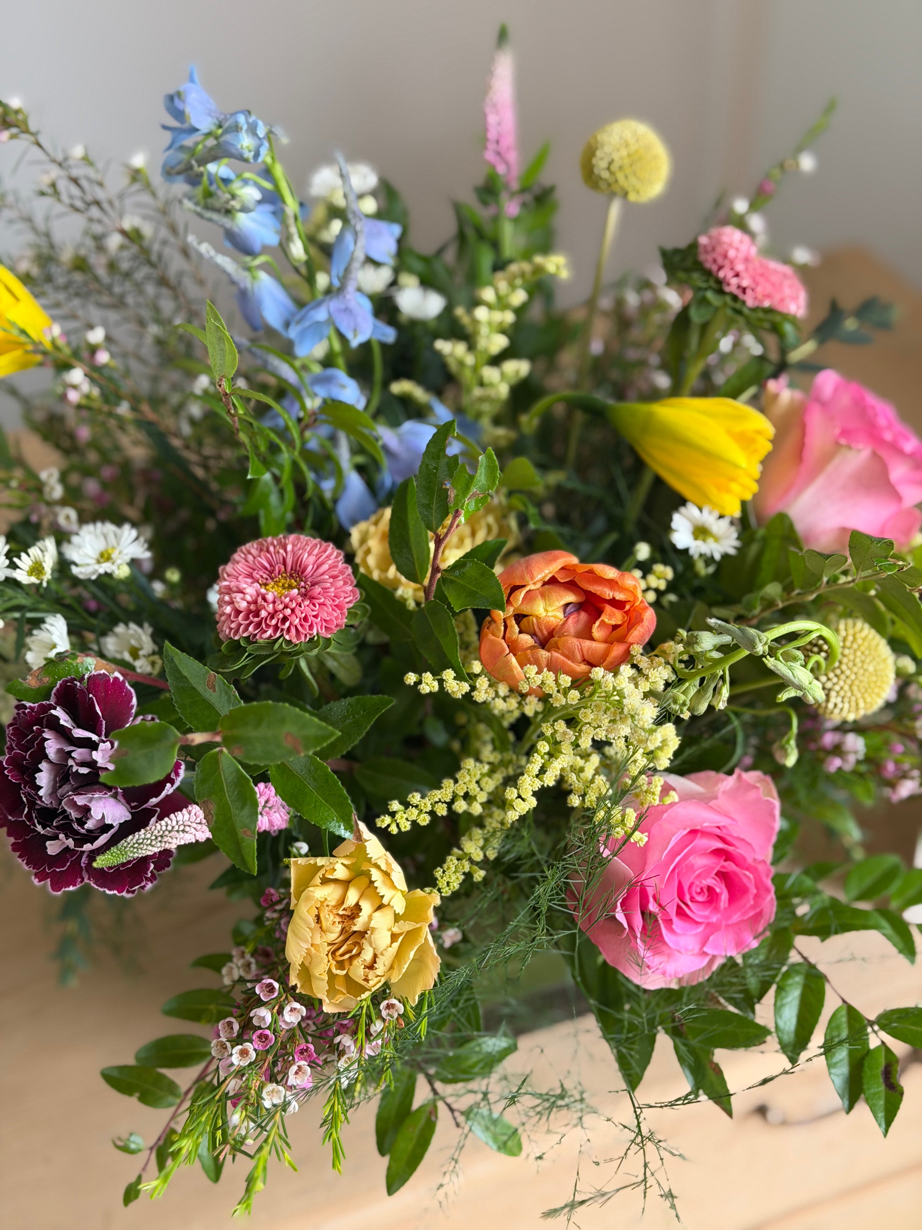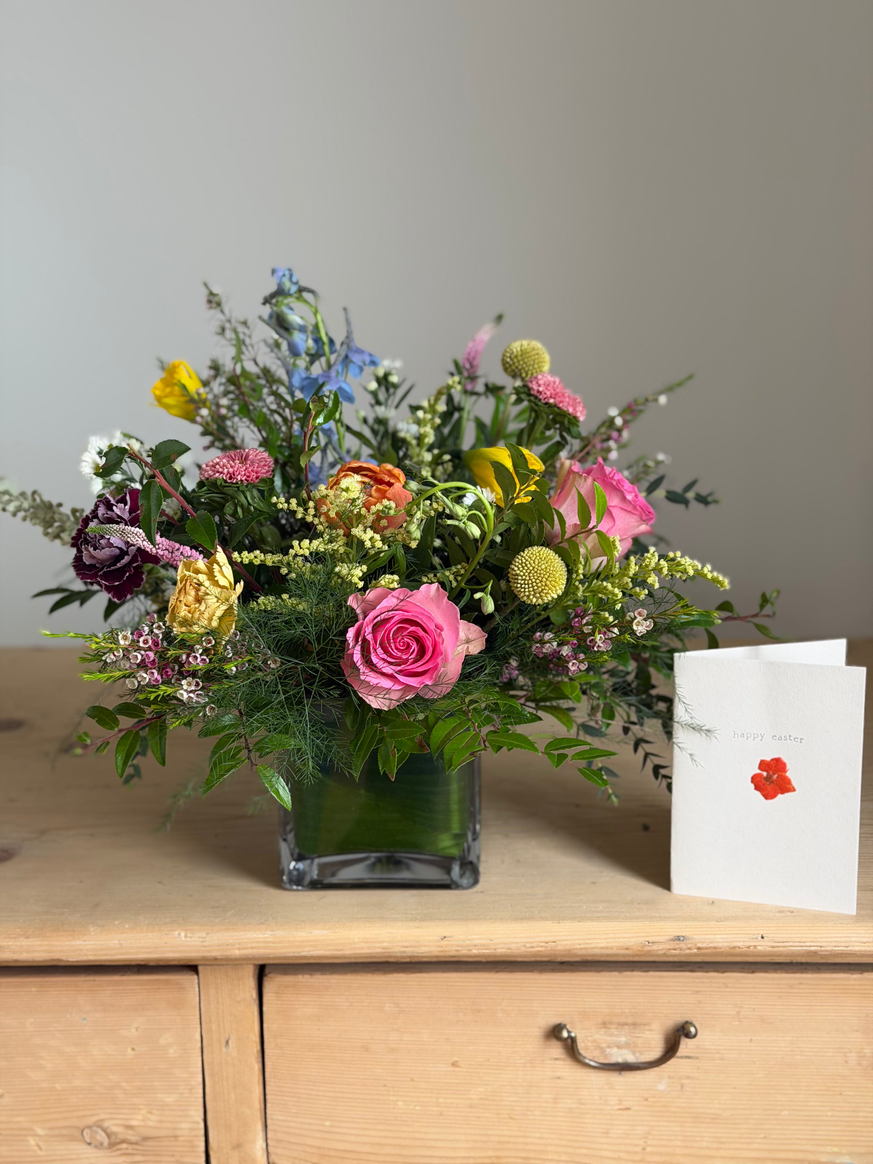 A darling centerpiece for Easter! This design is filled with spring florals such as: tulips, roses, aster, delphinium, craspedia, daffodils and other lovely blooms!
