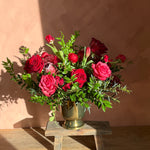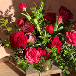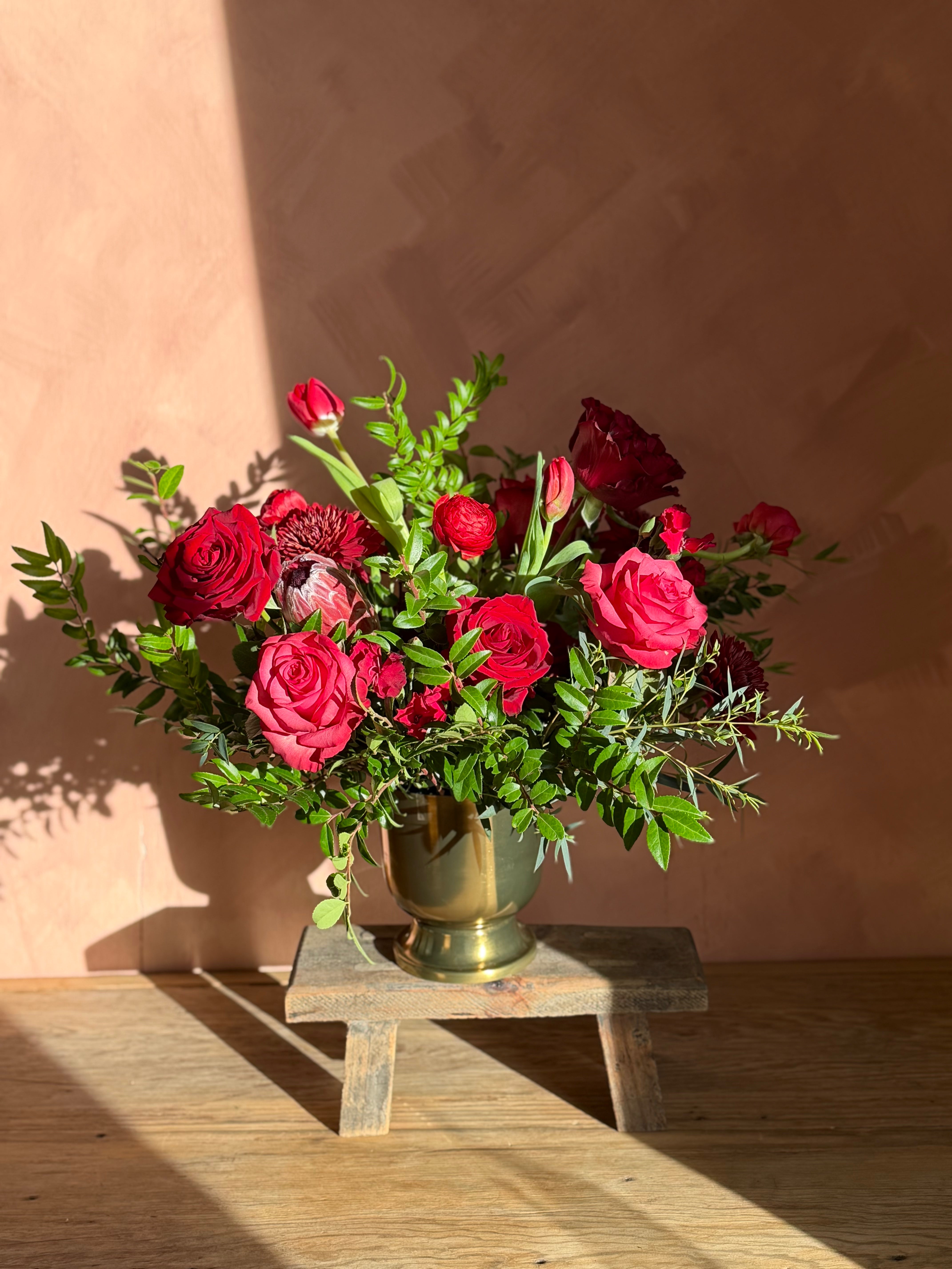 This arrangement is packed with blooms and is featured in a beautiful gold footed vase. Elegant and romantic.