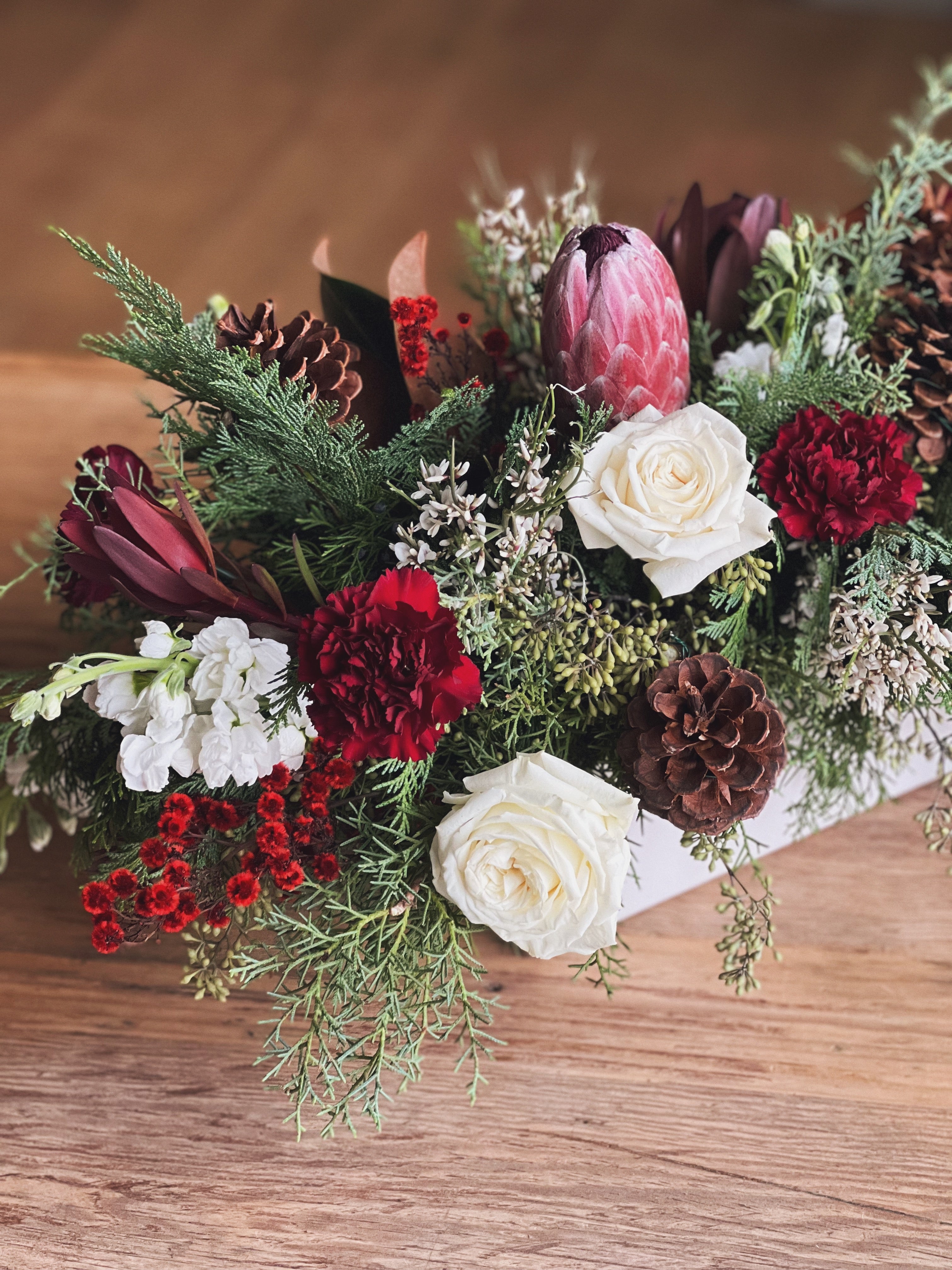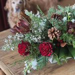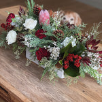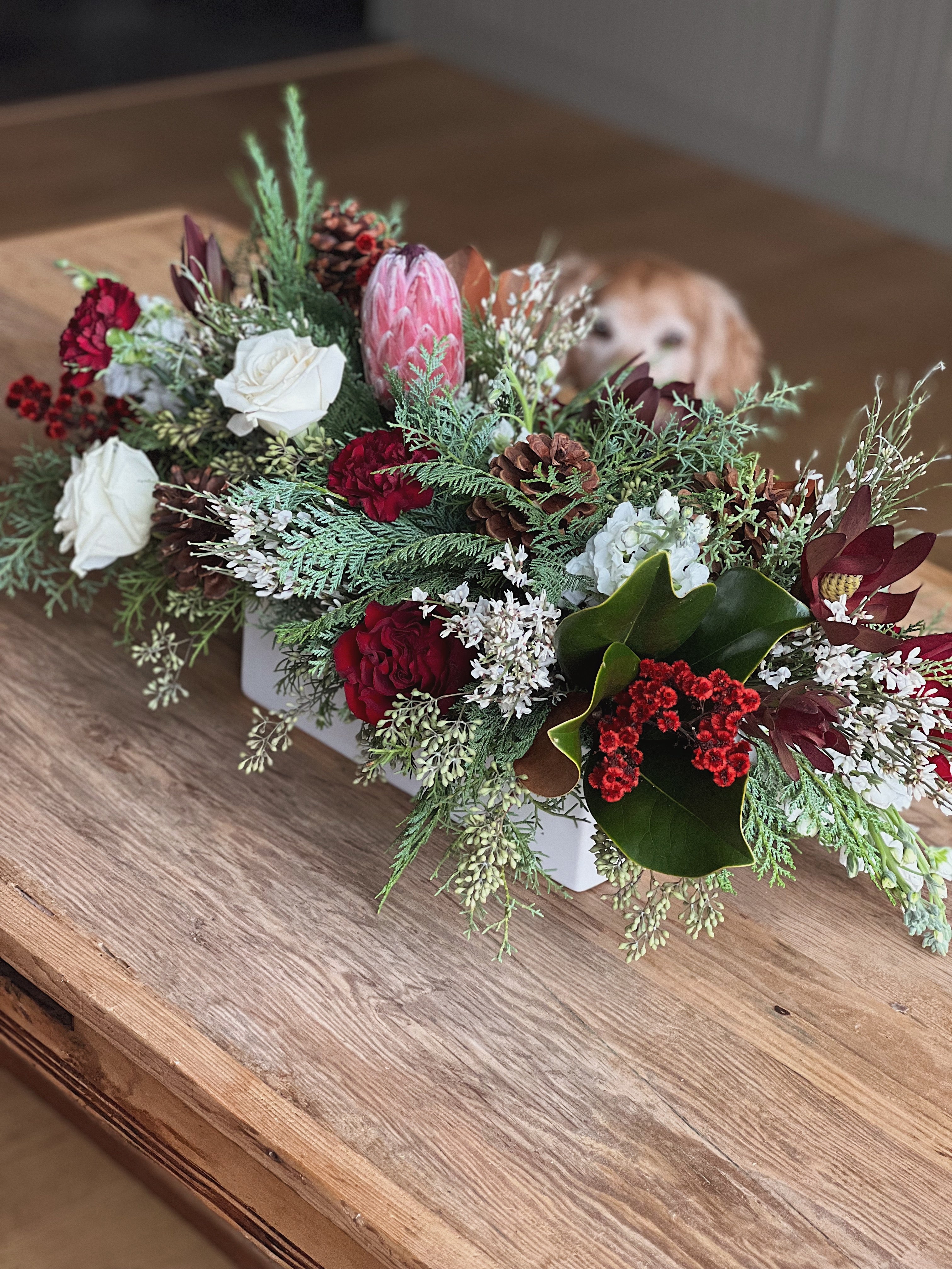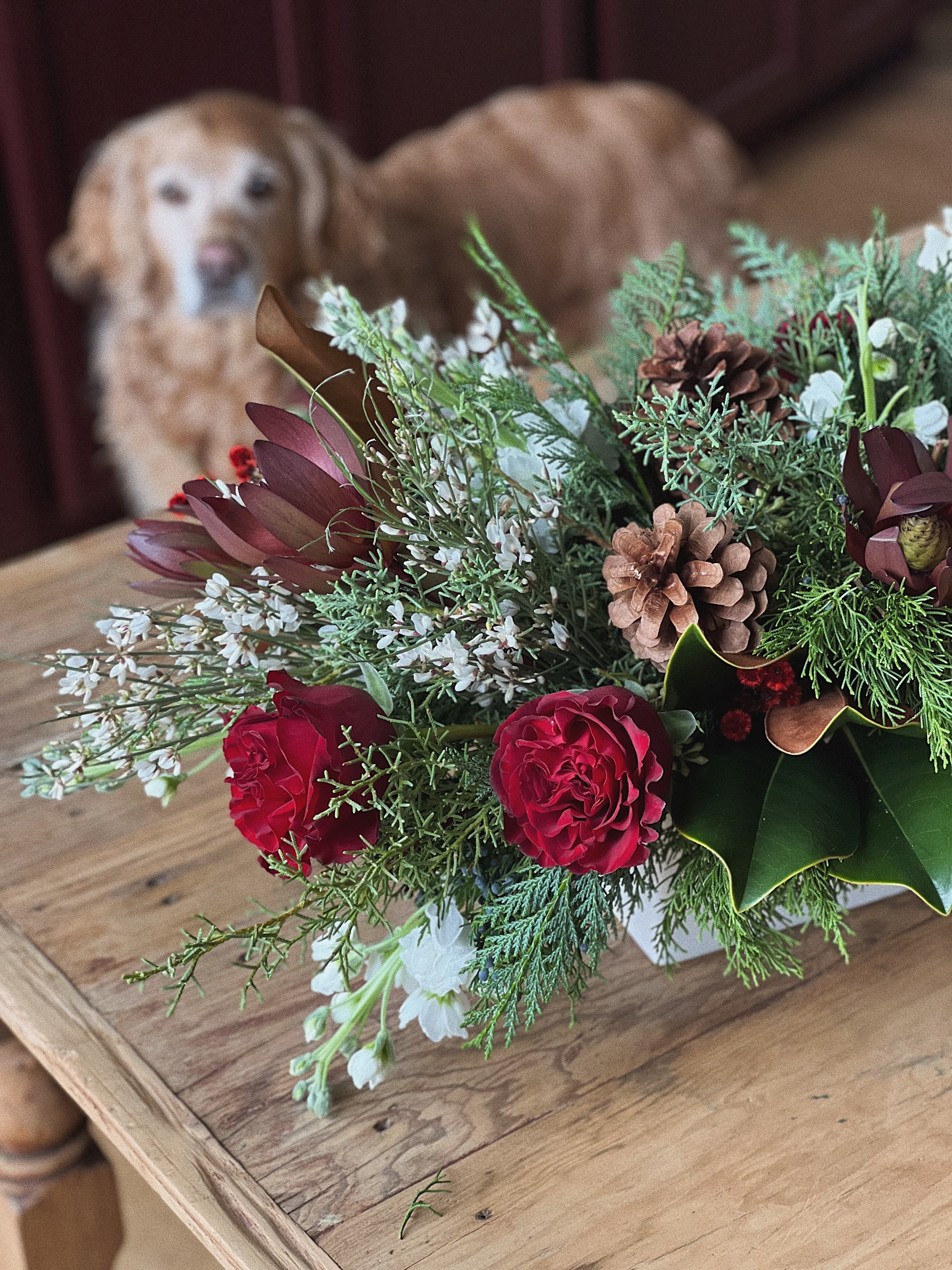 A perfect arrangement for a farmhouse style table. Rectangular in shape and low in design so no views will be obstructed. Bursting with those lush holiday blooms and fragrant greenery, this one is a true showstopper!