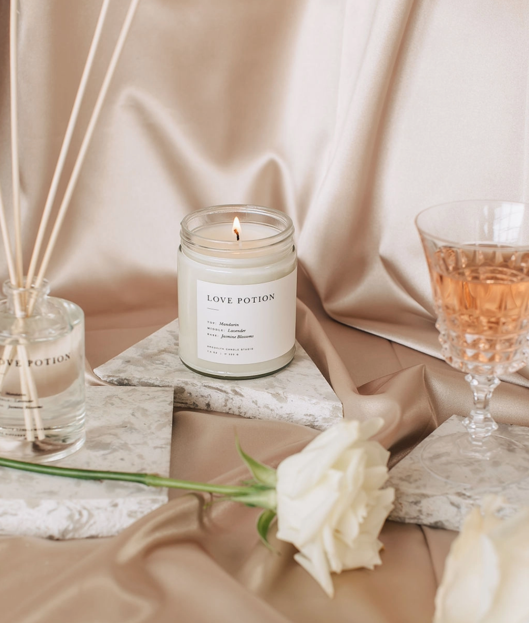 Exotic notes of jasmine blossoms, calming lavender, and bright mandarin—an olfactory experience reminiscent of a freshly picked bouquet of wildflowers. Hand poured into elegant straight sided clear glass jars with modern minimalist labels.