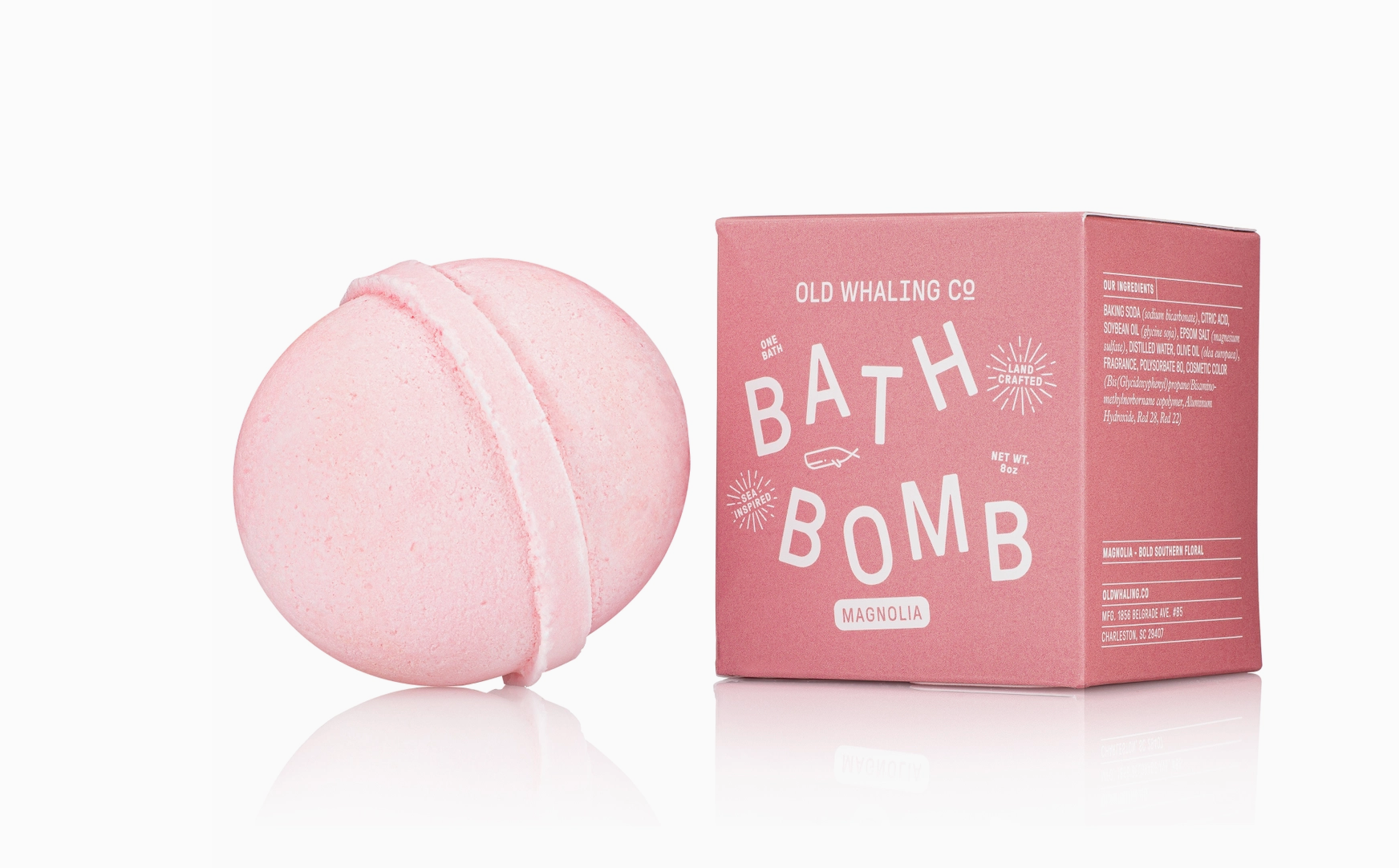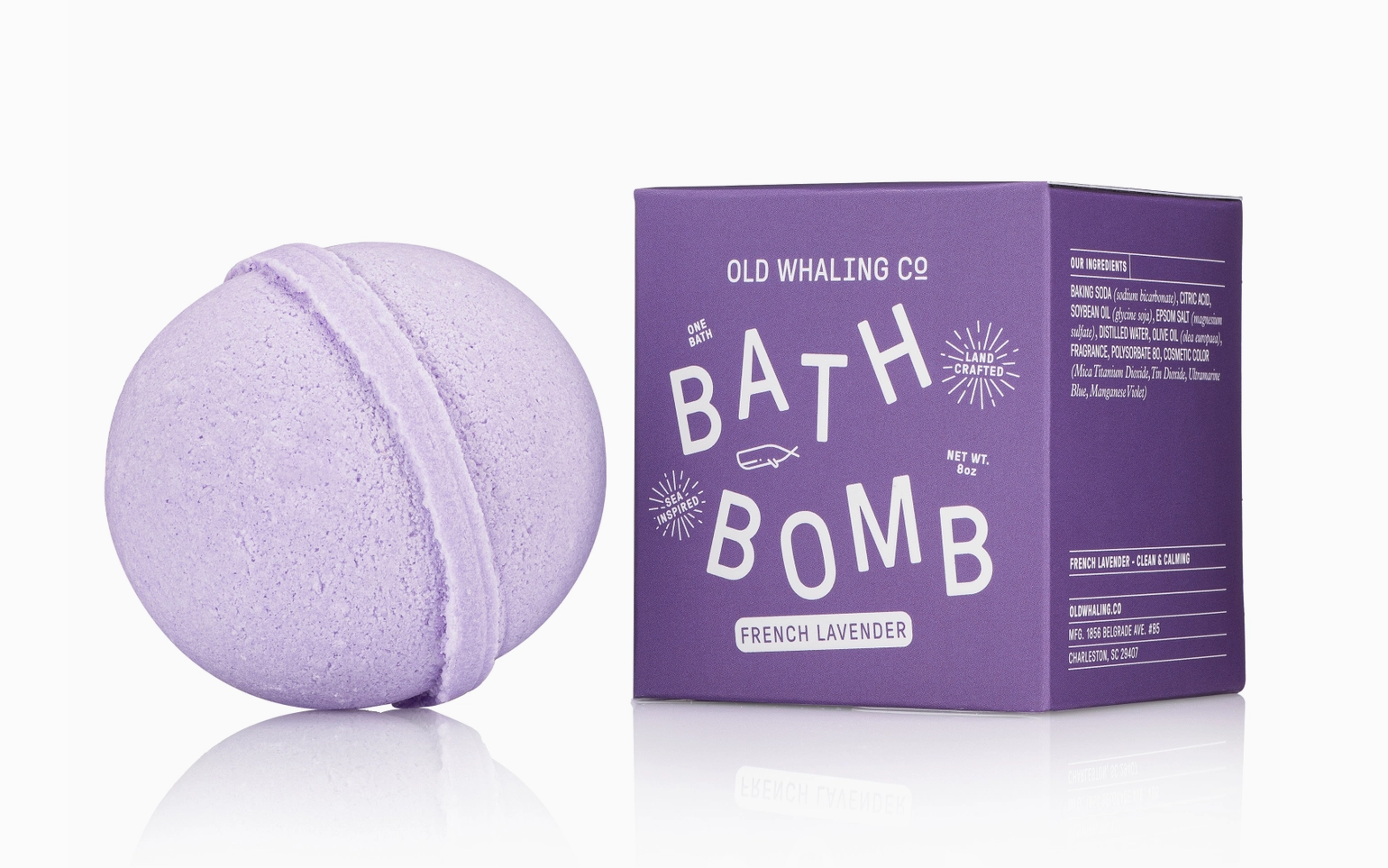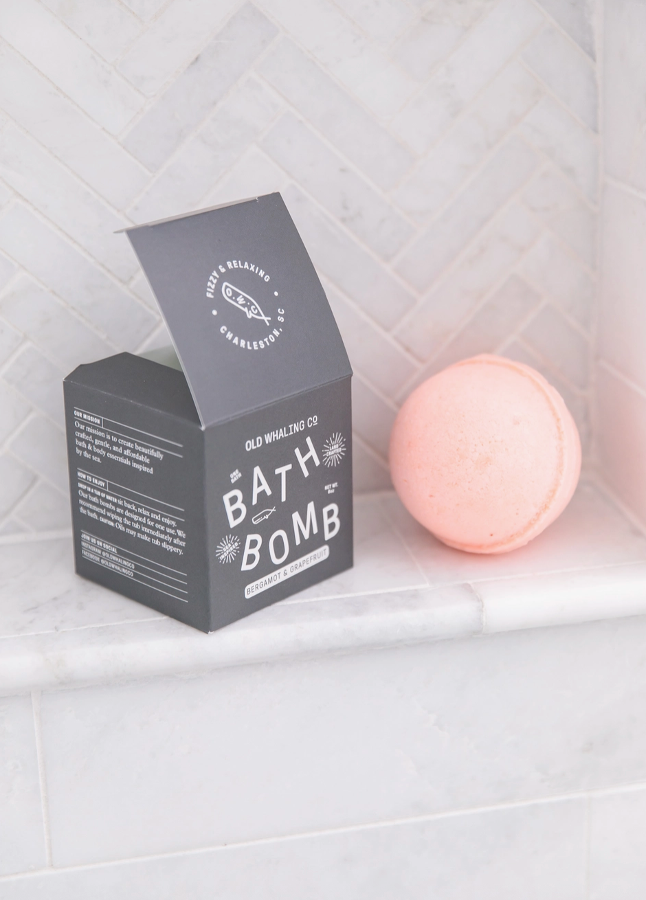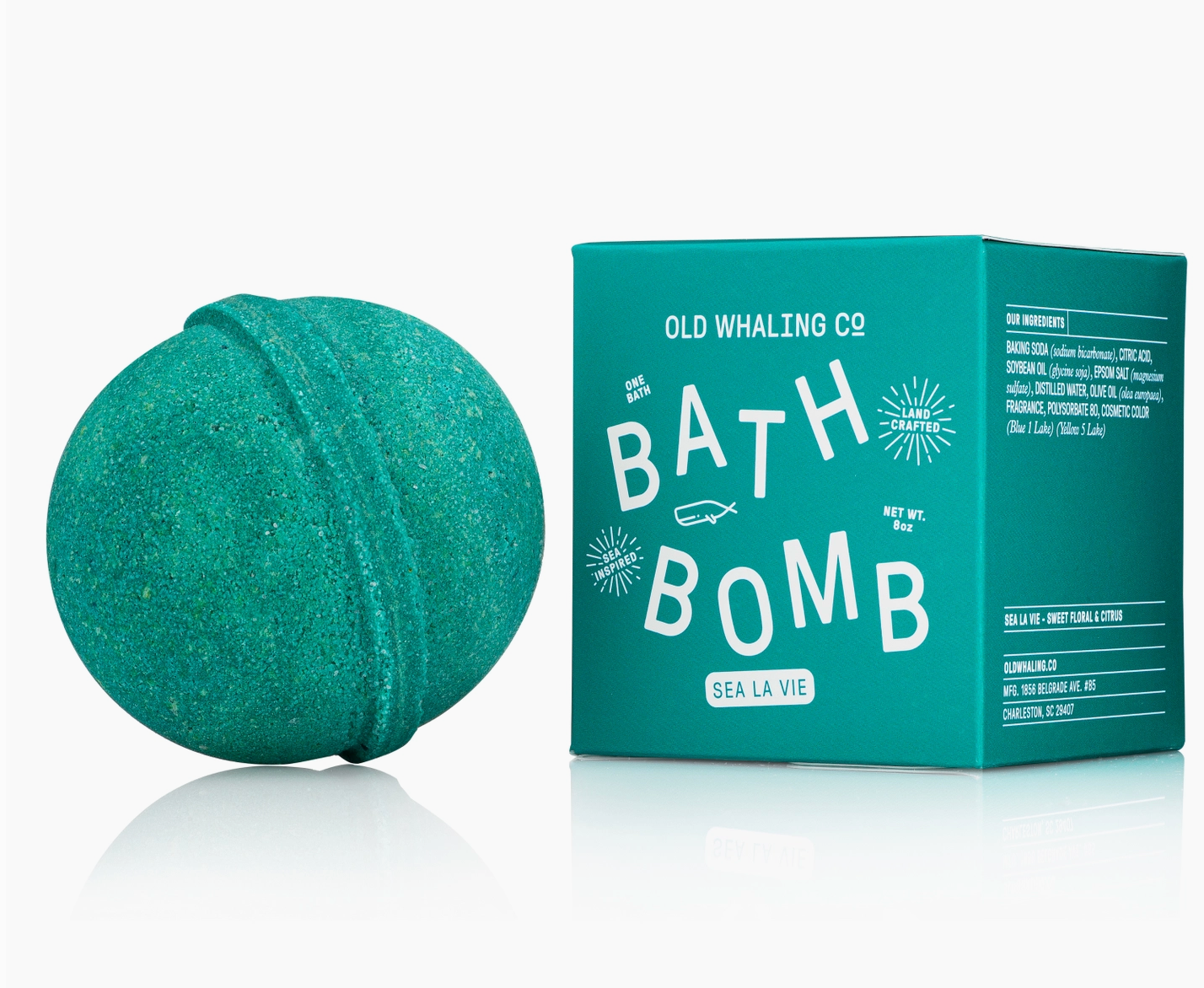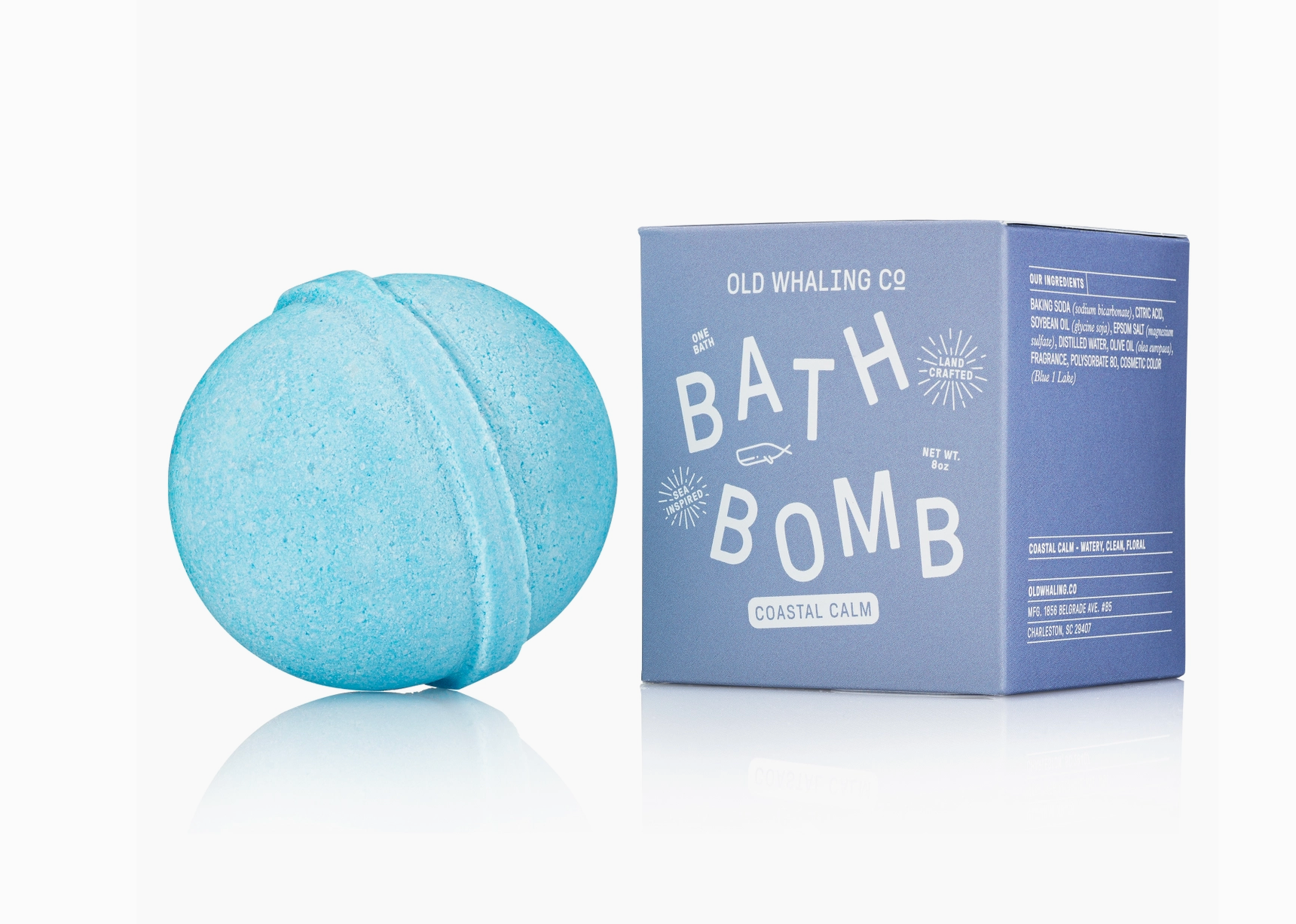 Handmade in historic Charleston, SC, with baking soda, citric acid, epsom salts, olive, and soybean oil, each Old Whaling Co. 8oz bath bomb will leave your skin feeling moisturized and lightly scented. These handcrafted bath bomb's have a soothing fizz and sea-inspired fragrance. These are perfect for a relaxing soak, rejuvenating the senses and cleansing the skin.