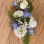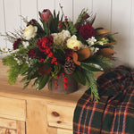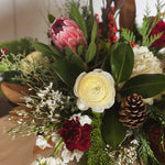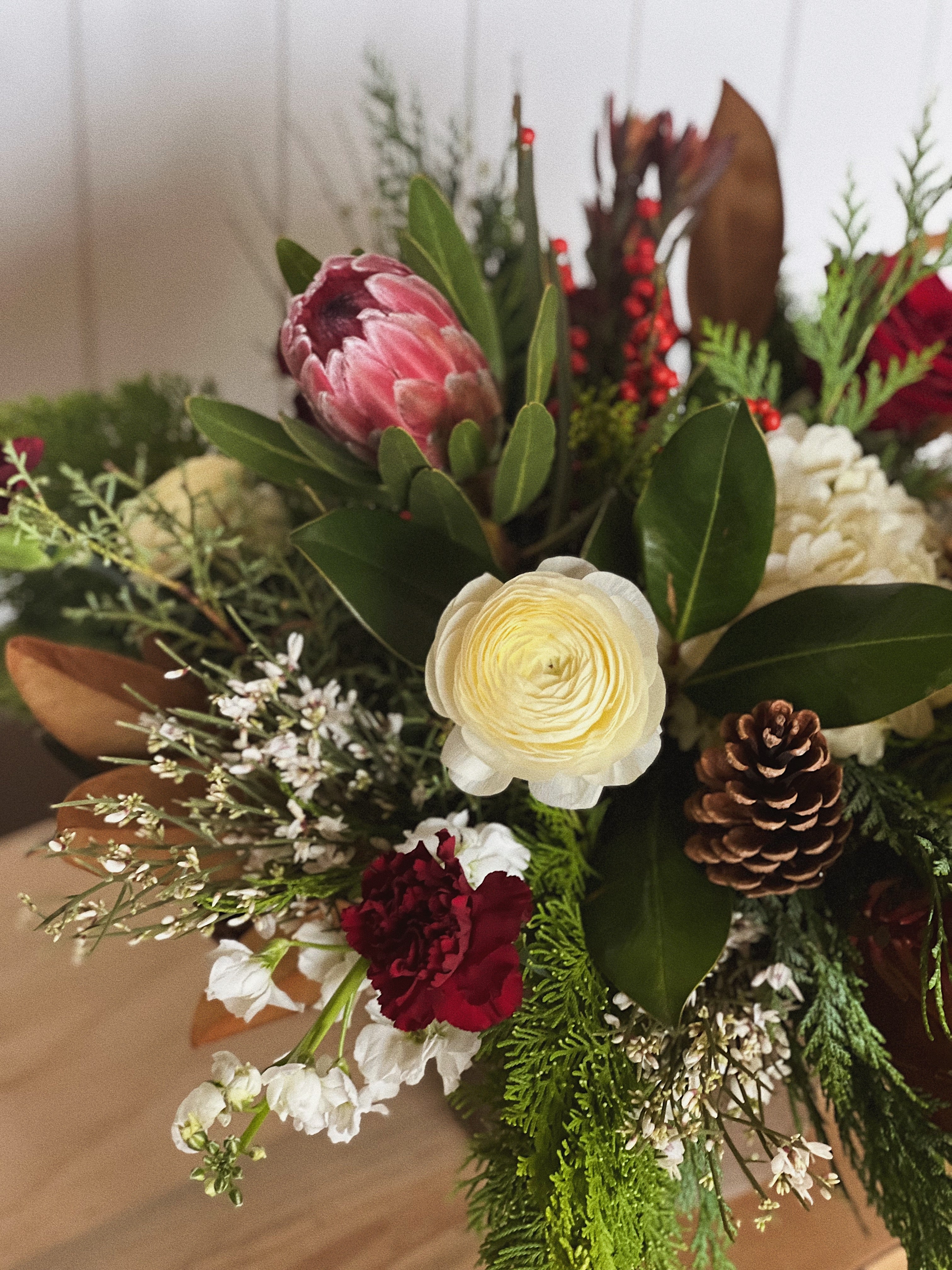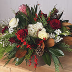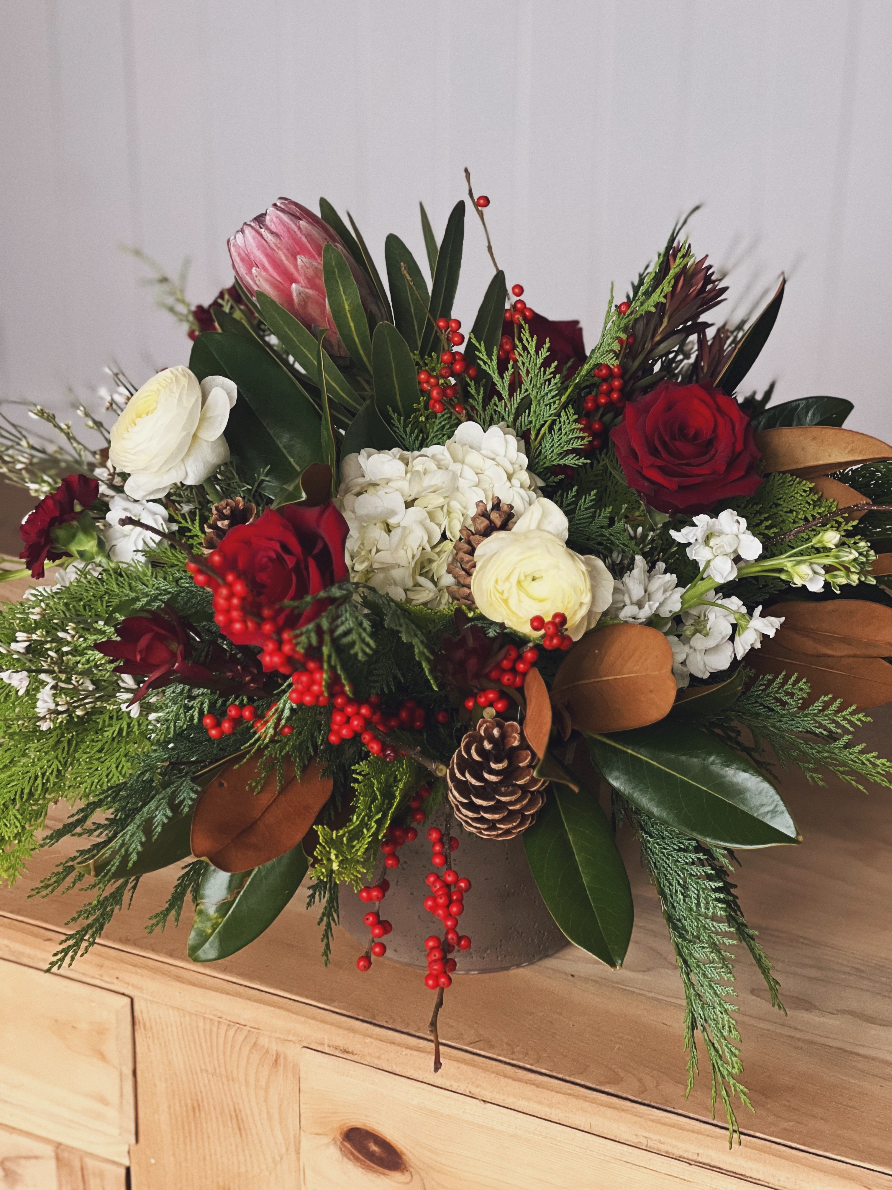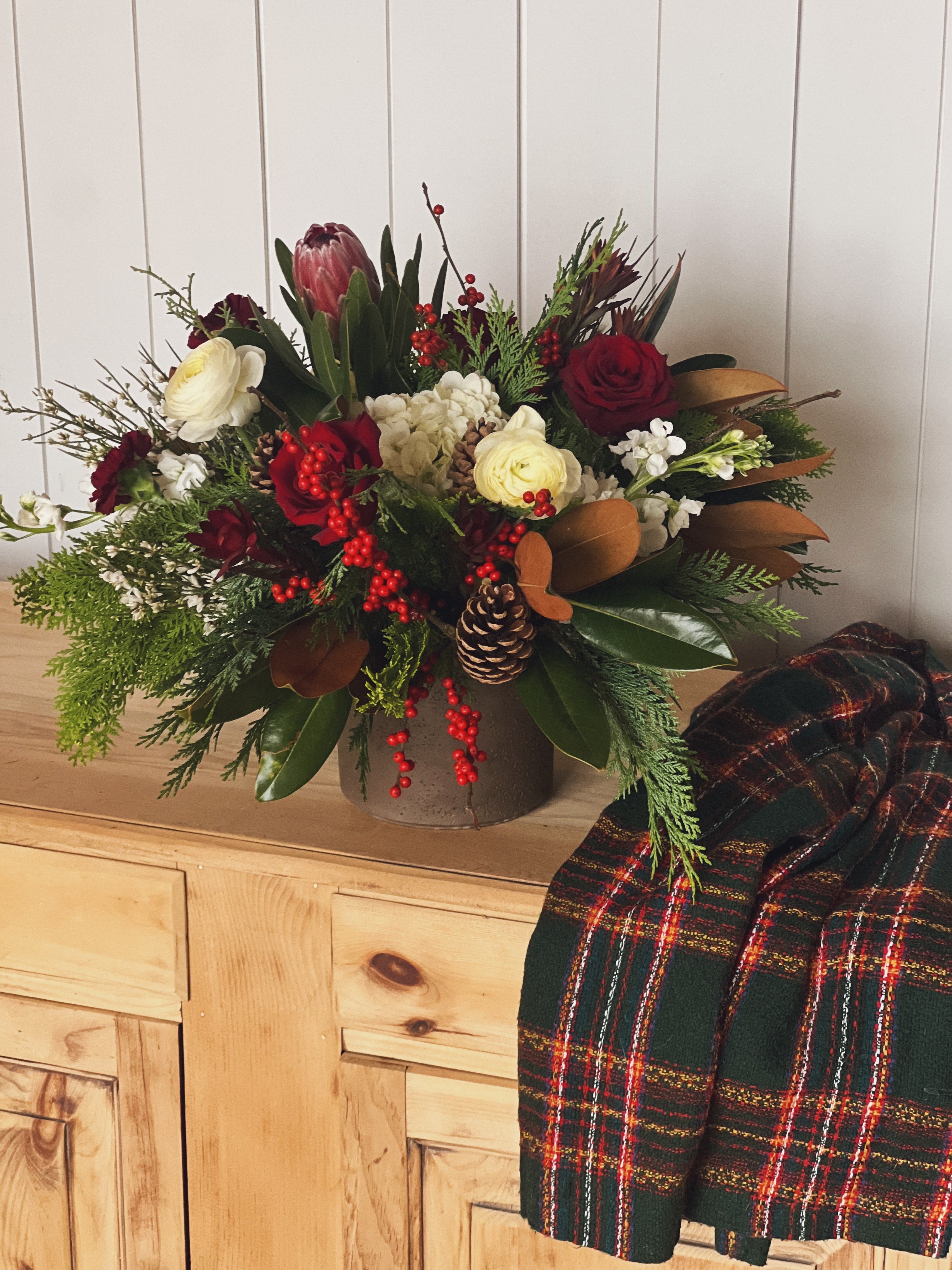 Inspired by classic elegance and holiday warmth. This arrangement features deep fragrant greens, berries, pine cones and holiday red tones! This centerpiece will bring so much spirit into the home. We use various berries, branches and texture. Perfect for the holiday season!