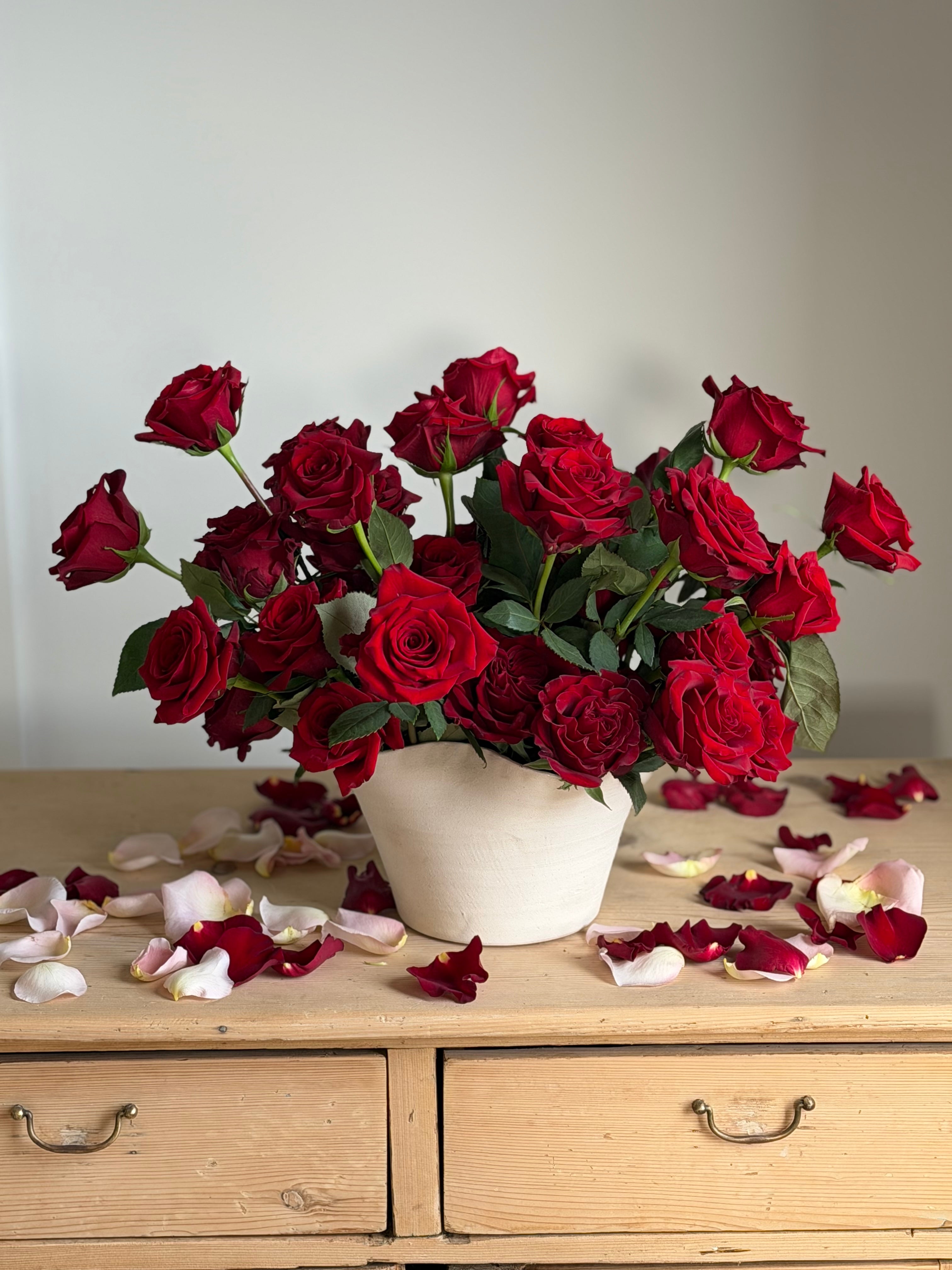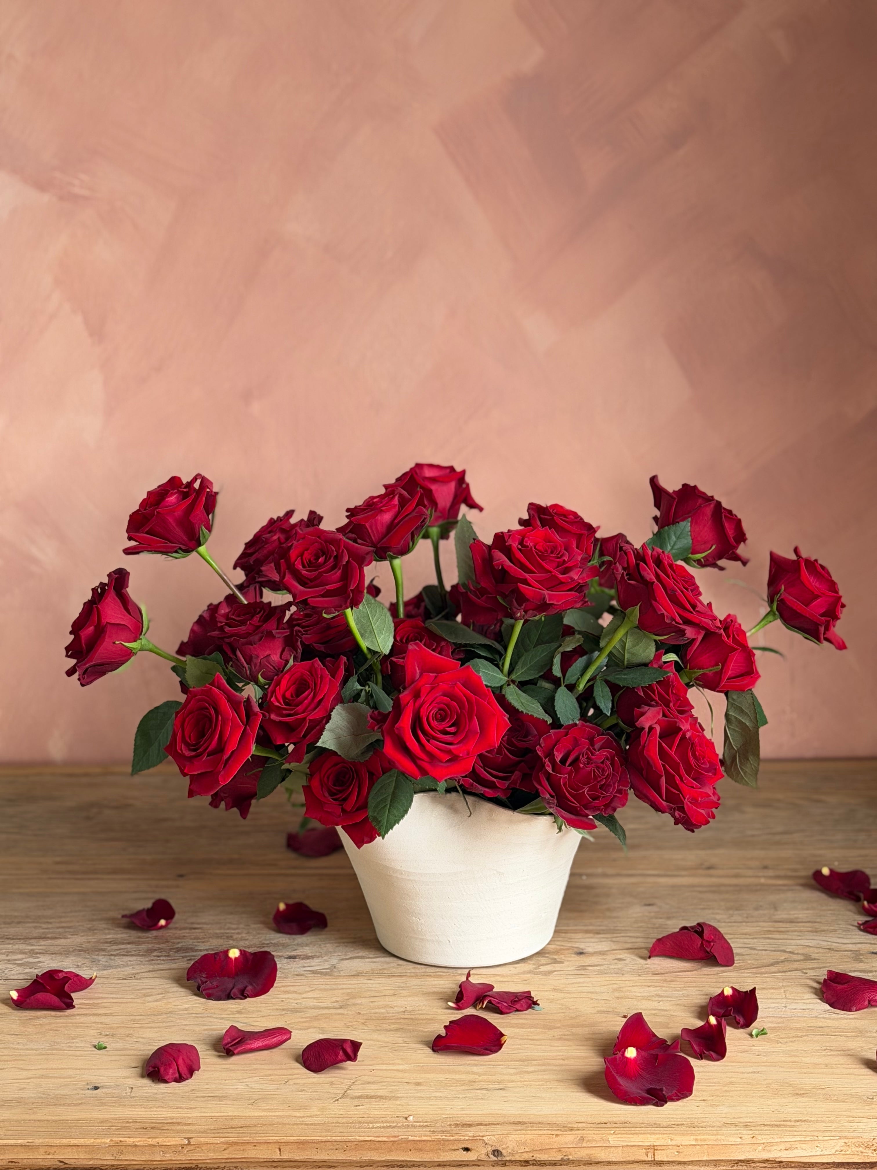 An unforgettable expression of love, the Grand Amour features three dozen premium roses, expertly arranged to create a full, overflowing silhouette. Each velvety bloom is thoughtfully placed for maximum impact, resulting in a timeless and indulgent design that speaks volumes—perfect for making a grand romantic statement.