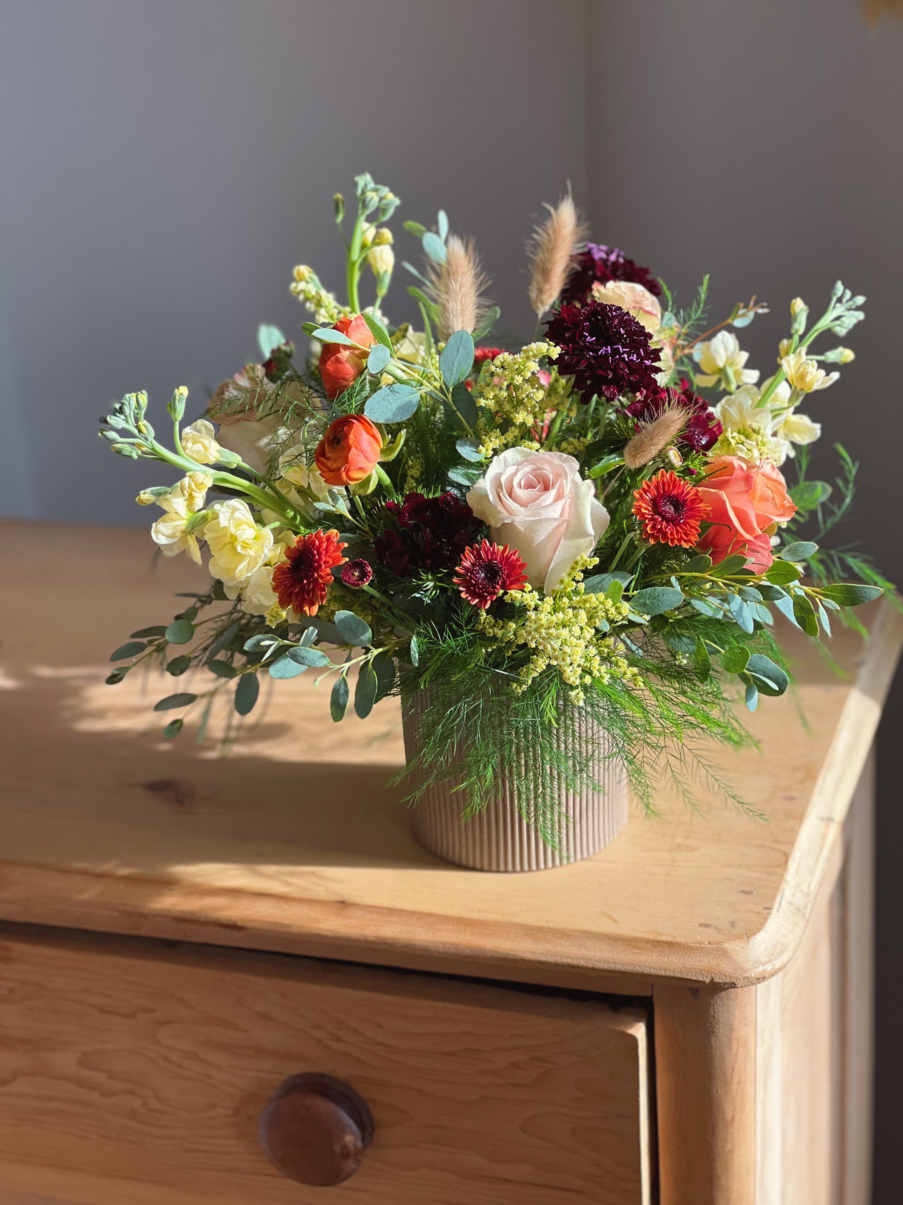 Flowers are subject to availability based on what's in season. We can't guarantee a certain flower, but we can guarantee your arrangement will be bursting with beautiful blooms!